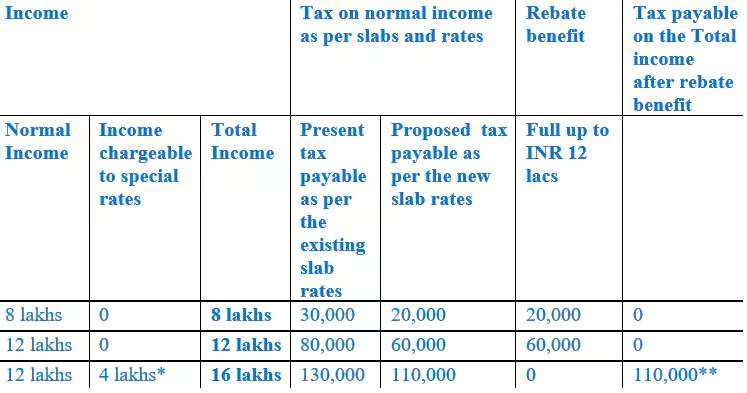 "Hence, assuming that the proposed changes to the IT Act are passed as is, the rebate provisions shall be available only in respect of the income tax computed on the normal income. However, if the total income of the taxpayer exceeds the minimum threshold limit, then the taxpayer shall be liable to pay on the total income without being entitled to the rebate available under section 87A, as being demonstrated in the above table," said Patnaik.