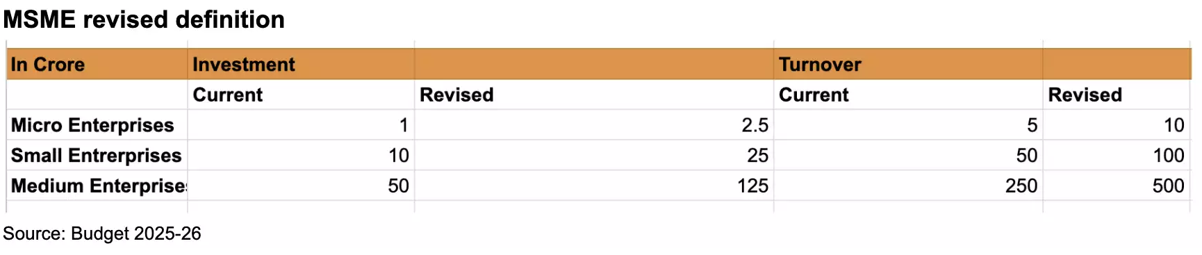 According to the Budget 2025, MSMEs with investments up to Rs 2.5 crore will now be classified as micro enterprises, an increase from the previous threshold of Rs 1 crore