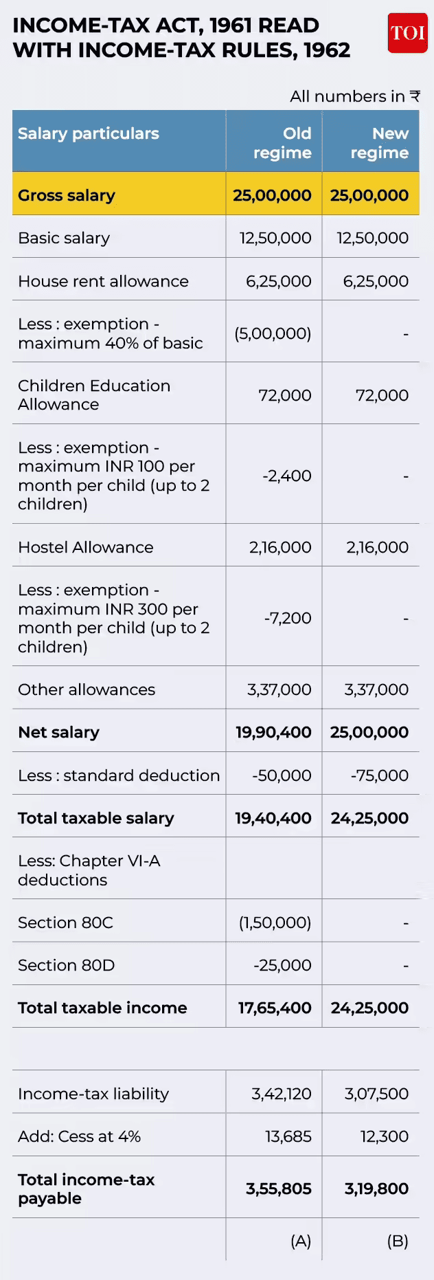 A sample comparison by EY for a salaried taxpayer earning gross salary of Rs 25,00,000 is given below wherein the taxpayer may be able to switch to old tax regime based on assumptions highlighted below the tables: